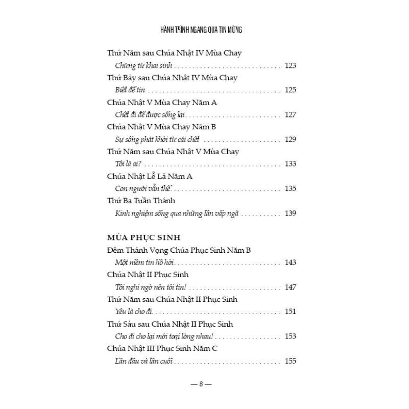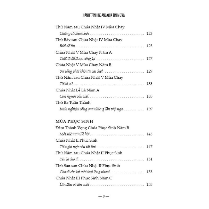 “Hành Trình Ngang Qua Tin Mừng” là một Tuyển tập những bài chia sẻ Lời Chúa mà tác giả đã viết cho tạp chí Dân Chúa Châu Âu và Sống Lời Chúa. Những bài chia sẻ được sắp xếp theo lịch phụng vụ: từ Mùa Vọng tới Mùa Giáng Sinh, từ Mùa Thường Niên tới các Lễ Riêng, và từ Mùa Chay tới Mùa Phục Sinh. Vì đây là hành trình ngang qua Tin Mừng nên không phải ngày nào cũng có bài chia sẻ. Ở phần cuối của cuốn sách, tác giả đính kèm những bài viết về lòng thương xót mà Tuyển tập Sống Lời Chúa đã xuất bản xuyên suốt Năm Lòng Thương Xót.