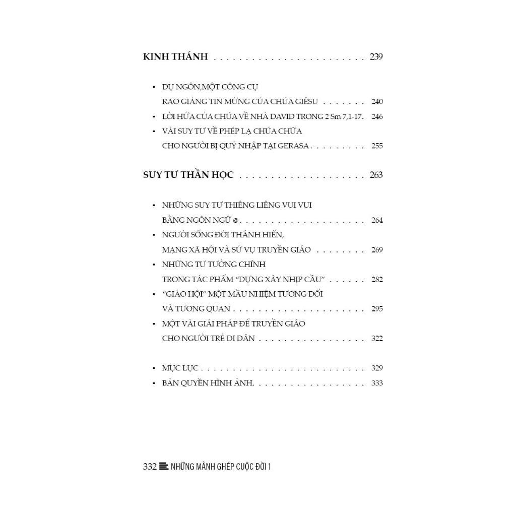 Bạn thân mến! Trên tay bạn là một bộ sưu tập những mảnh ghép của cuộc đời, lượm lặt từ trong những góc suy tư và những miền cảm xúc của một người trẻ luôn thao thức tìm ý nghĩa đời mình giữa cuộc nhân sinh vần xoay biến thiên theo năm tháng. Những mảnh ghép này là những suy tư được viết ra từ trong nhiều hoàn cảnh, thời gian và biến cố khác nhau. Chúng có thể là những tản văn, những câu truyện ngắn được ra đời khi chàng thanh niên thuở nào nhận ra rằng bản thân mình cũng có thể coi viết lách là một thú vui để tập có cái nhìn đa chiều hơn về nhiều khía cạnh trong cuộc sống. Chúng cũng có thể là những bài viết được ra đời nhân một biến cố nào đó trong đời sống đức tin hay đời sống thường ngày, khi chàng thanh niên thuở nào giờ đây đã khoác trên mình chiếc áo chùng thâm của đời chủng sinh và bắt đầu tập nhìn mọi thứ sâu xa hơn như một thao thức hiếu tri. Chúng cũng có thể là những suy tư mà thầy Đại Chủng Sinh ấy cảm nhận và góp nhặt trong quá trình sống tại Đại Chủng Viện, qua những môn học triết học và thần học được hấp thụ trong suốt quá trình đào tạo xuýt xoát một thập kỷ, hay trong hành trình mục vụ của mình với những kinh nghiệm được chín muồi theo năm tháng. Và nay khi là một Linh mục trẻ, người viết ấy muốn gửi “những mảnh ghép cuộc đời” đến bạn như một món quà nho nhỏ, đơn sơ và thân tình, dễ thương và chân thật. Không dám mong bộ sách “những mảnh ghép cuộc đời” này là một thứ hàn lâm tinh túy đến mức hoàn hảo có thể thỏa mãn nhu cầu của những đấng bậc học sâu hiểu rộng, chỉ mong được chia sẻ với những ai đồng cảm với một người trẻ thích cầm viết hí hoáy về nhiều khía cạnh trong cuộc sống. Mong rằng những tư tưởng trong “Những mảnh ghép cuộc đời” này có thể là chút gia vị nào đó cho cuộc sống muôn màu muôn vẻ thêm phần thú vị.