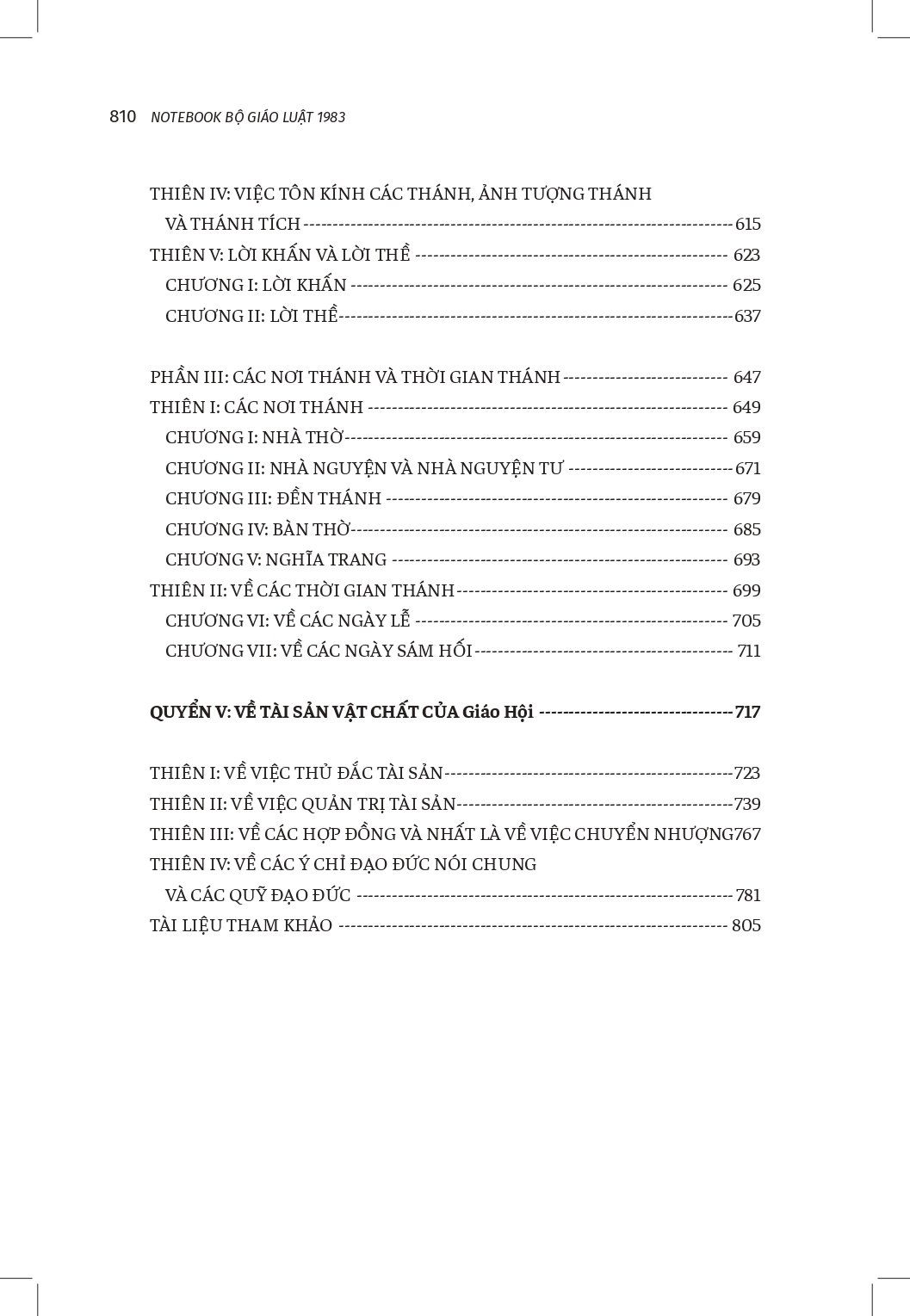 QUYỂN V: VỀ TÀI SẢN VẬT CHẤT CỦA GIÁO HỘI đề cập đến khía cạnh quản lý tài chính và tài sản của Giáo hội. Cuốn sách này xác định các nguyên tắc về việc sở hữu, quản lý và chuyển nhượng tài sản, đảm bảo tính minh bạch, trách nhiệm giải trình và mục đích sử dụng phù hợp, phục vụ cho sứ mạng của Giáo hội và phúc lợi của cộng đồng.